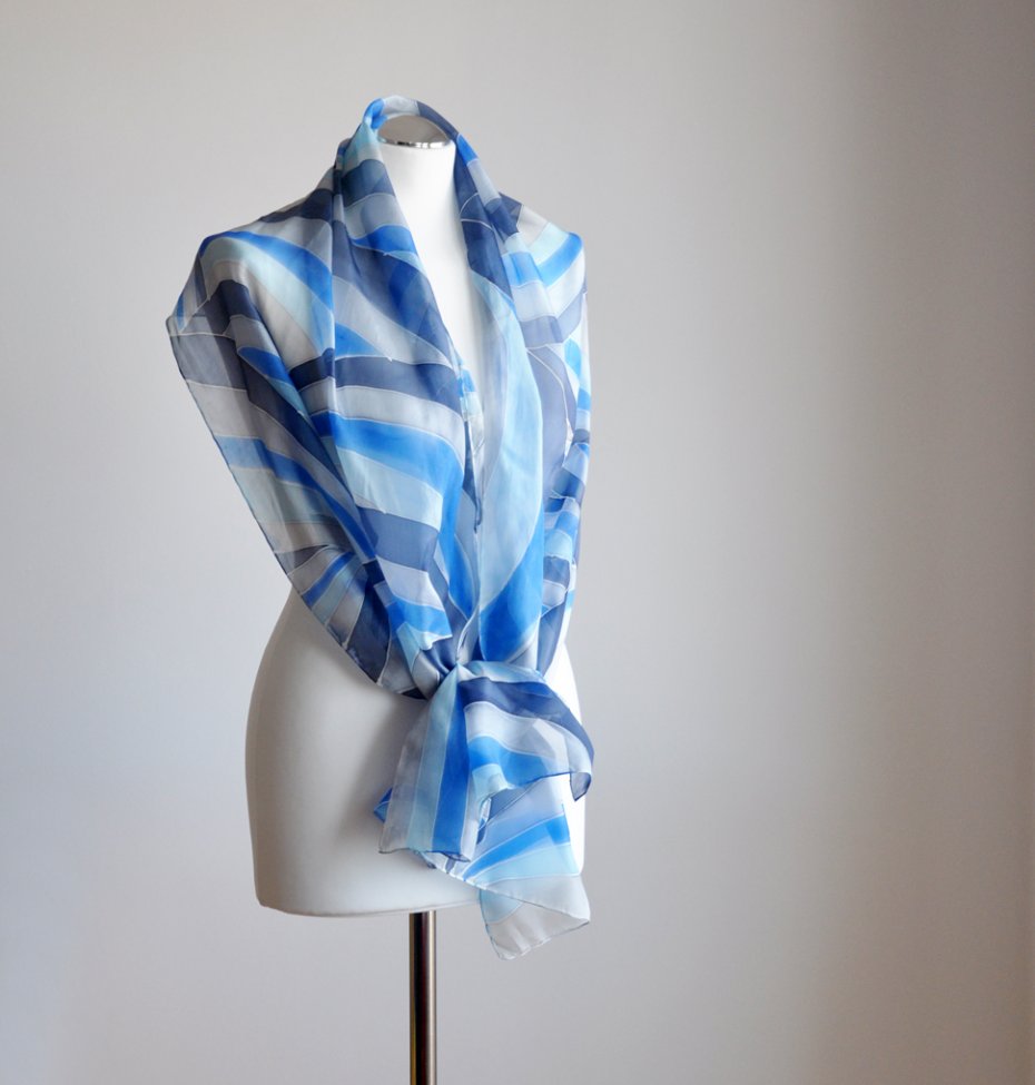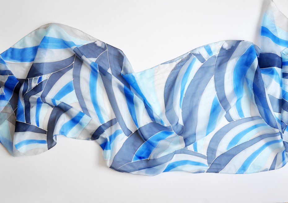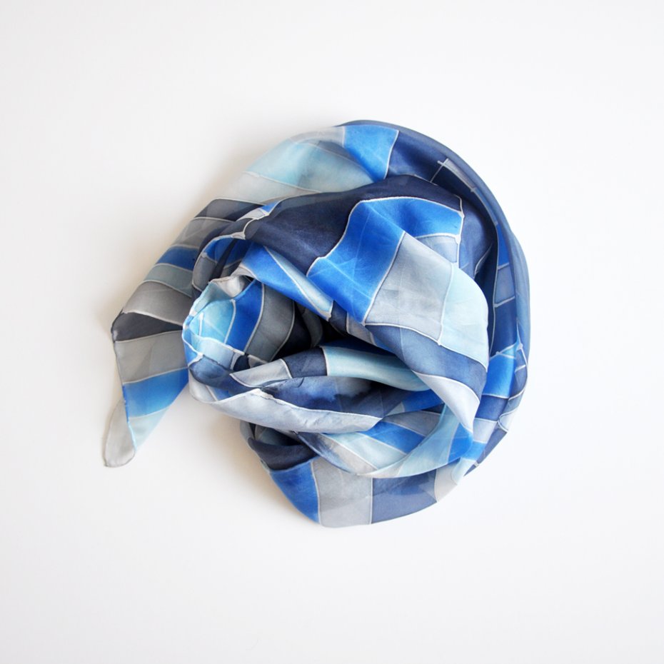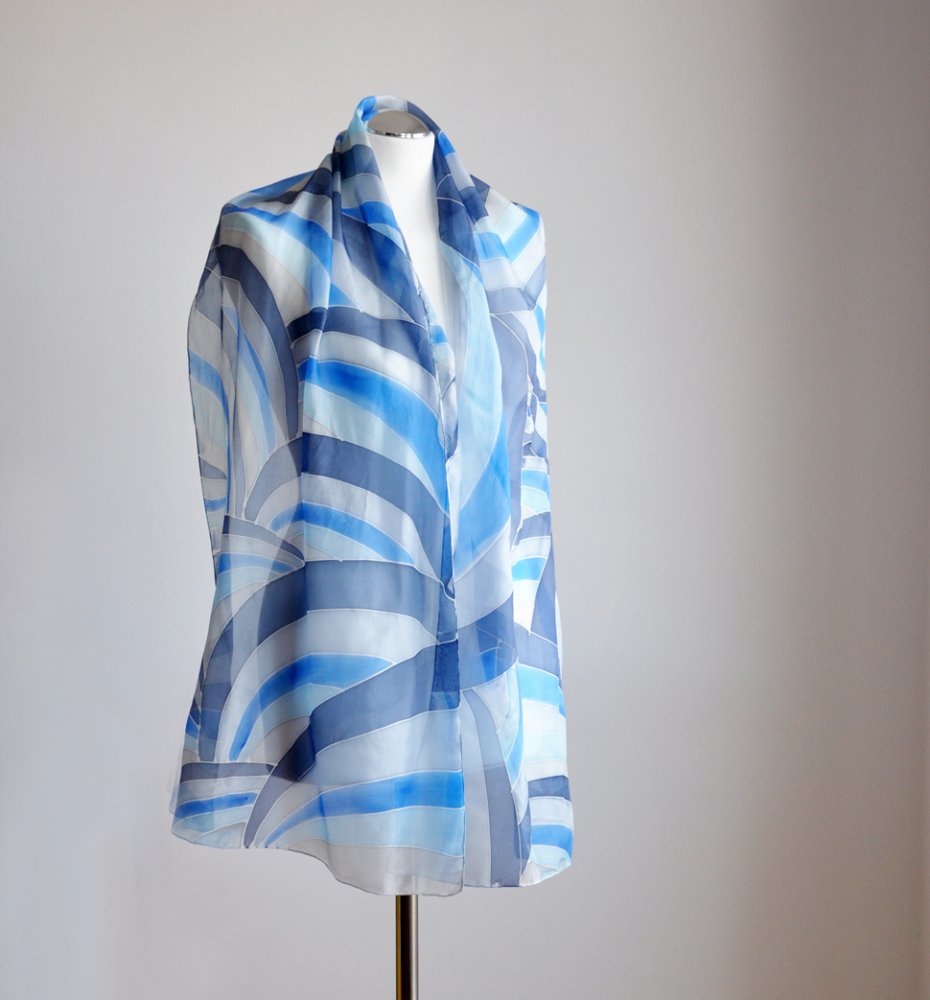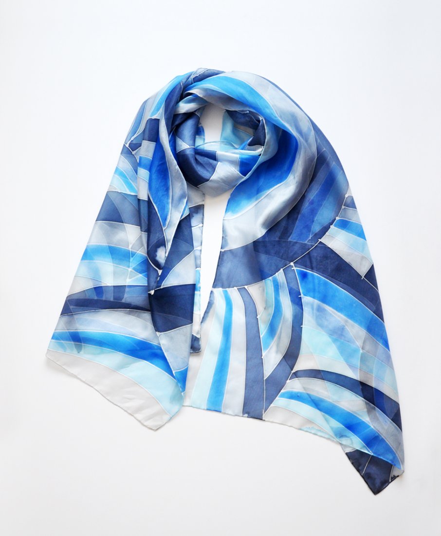 Delikatny, ręcznie malowany, jedwabny szal w odcieniach granatu, błękitu, szarości i bieli. Wzór jest graficzną abstrakcją podkreśloną guttą w kolorze bieli. Szal podpisany przez autorkę. Wymiary szala to 45x180cm. Do szala dołączona jest obszerna informacja o jedwabiu, malowaniu na nim i sposobie dbania o niego. Szal zapakowany jest w ręcznie malowaną ekologiczną torebkę.
