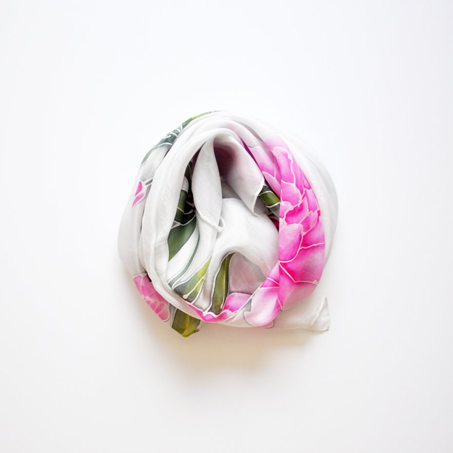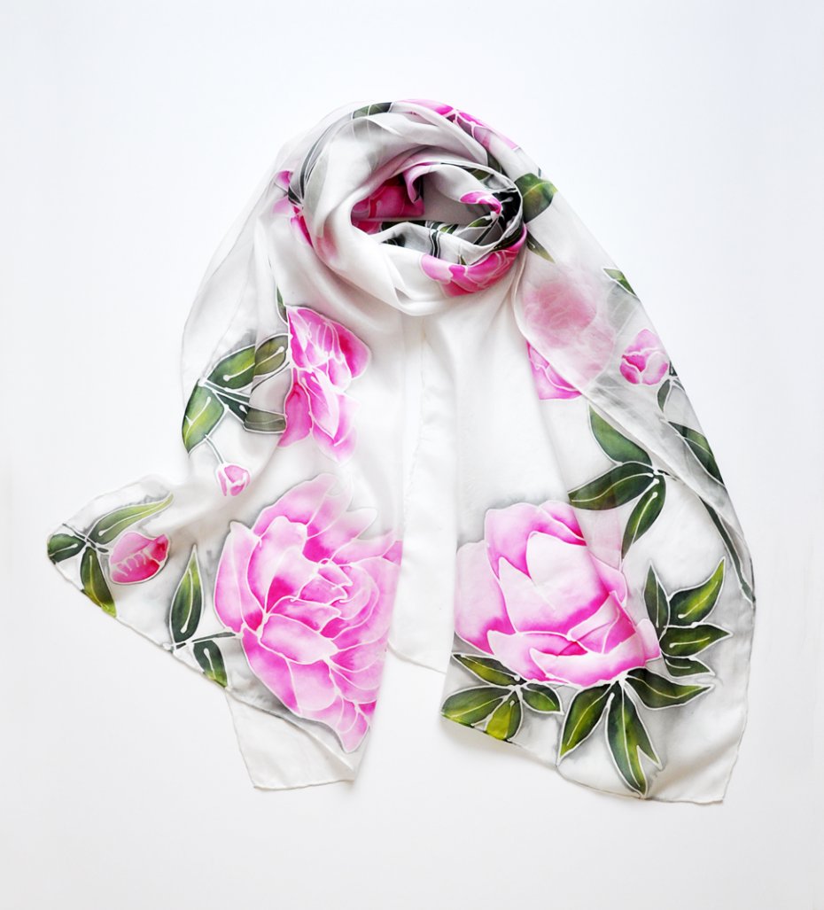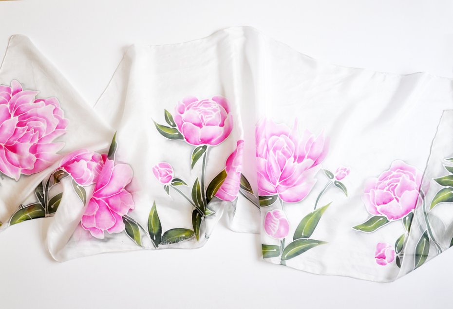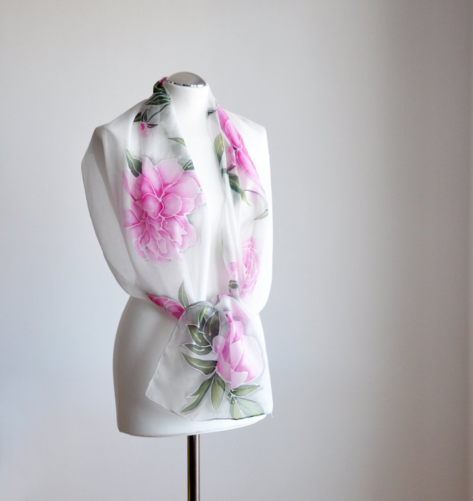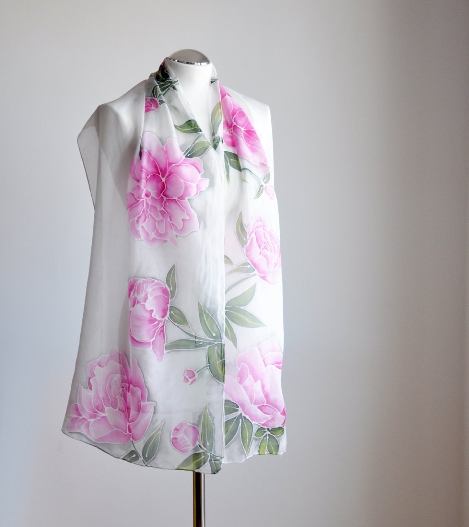 Delikatny, ręcznie malowany, jedwabny szal o wzorze piwonii. Projekt szala to rozmalowane po całej długości szala kwiaty piwonii w odcieniach różu. Kompozycje uzupełnia zieleń liści. Tło szala to odcienie bardzo delikatnej szarości, która jest prawie niewidoczna. Szal podpisany przez autorkę. Wymiary szala to 45x180cm. Szal będzie namalowany specjalnie dla Ciebie więc będzie różnił się minimalnie od tego co na zdjęciach.