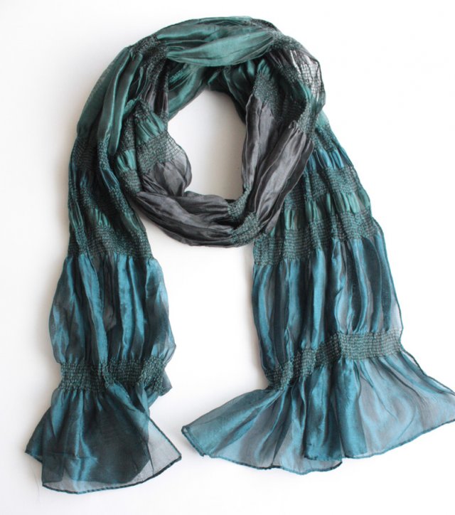 Zwiewny, cieniowany szal o ciekawym fasonie, marszczony gumkami. Materiał to prawdopodobnie jedwab naturalny lub syntetyczny.