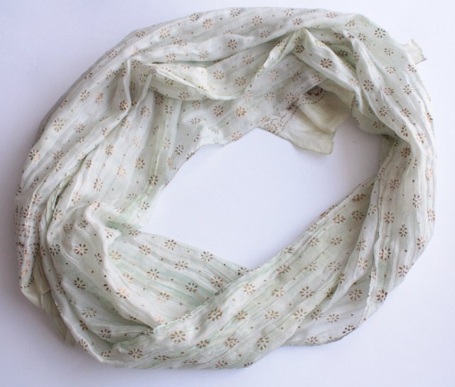 Nietypowy jedwabny szal najprawdopodobniej ręcznie malowany we wzory w kolorze starego złota na tle bardzo jasnego seledynu. Tkanina jest naturalnie gnieciona.