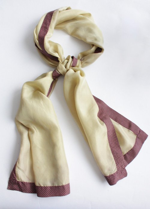 Szal marki NOA NOA w ciekawym, subtelnym odcieniu beżu z nutą pistacji. Obwódka w kolorze śliwkowego brązu. Materiał oceniam na jedwab.