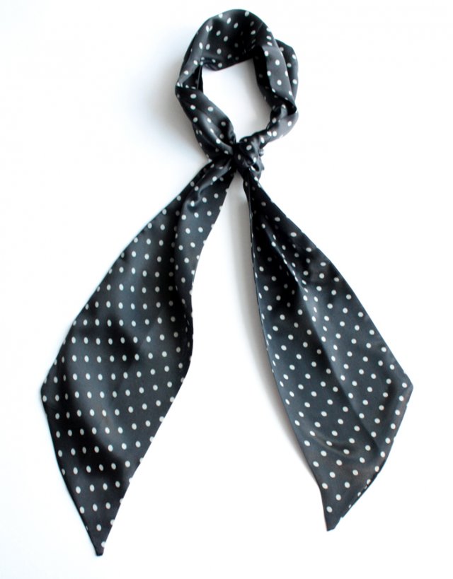 Podwójnie zszytym, elegancki szal w groszki marki NOA NOA. Materiał to w mojej ocenie 100% jedwab.