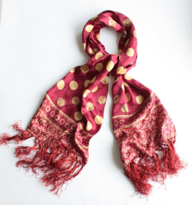 Piękny wytłaczany szal w orientalne wzory, wykończony efektownymi frędzlami. Materiał to prawdopodobnie jedwab.