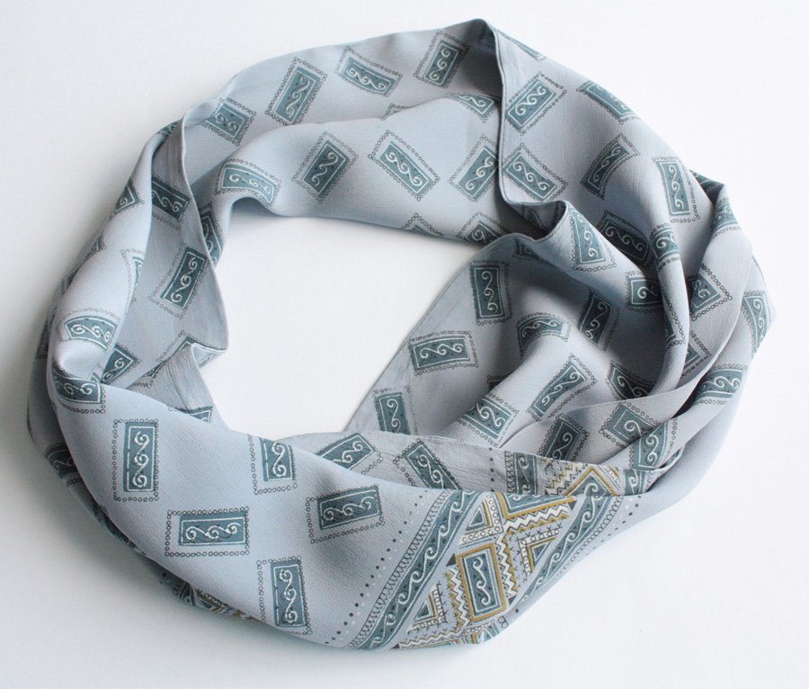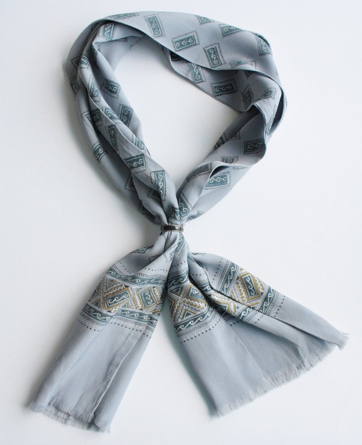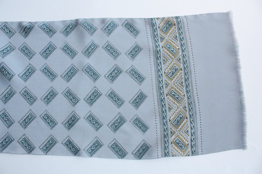 Subtelny szal wykonany prawdopodobnie z jedwabiu. Zszyty podwójnie, wykończony delikatnymi, krótkimi frędzelkami. Kolor tła to błękit przechodzący w gołębią szarość.