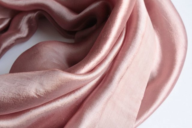 Duży, elegancki szal w stonowanym odcieniu pudrowego różu, o delikatnym połysku.