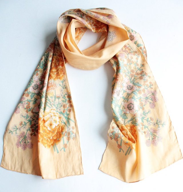 Zwiewny, romantyczny szal w kwiatowe wzory na herbacianym tle. Materiał to prawdopodobnie jedwab.