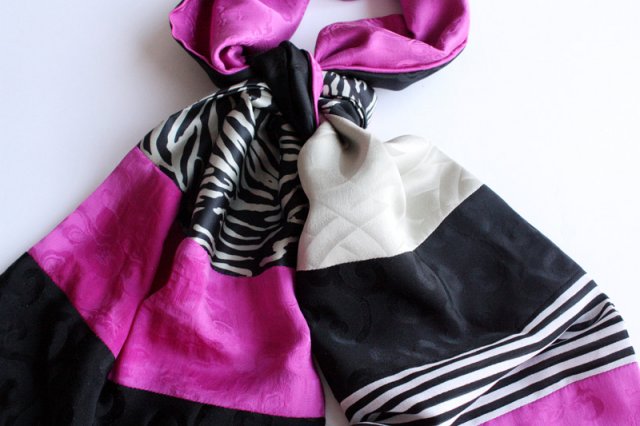 Podwójnie zszyty szal składający się z różnych tkanin w różnych kolorach i deseniach. Materiał to prawdopodobnie jedwab.