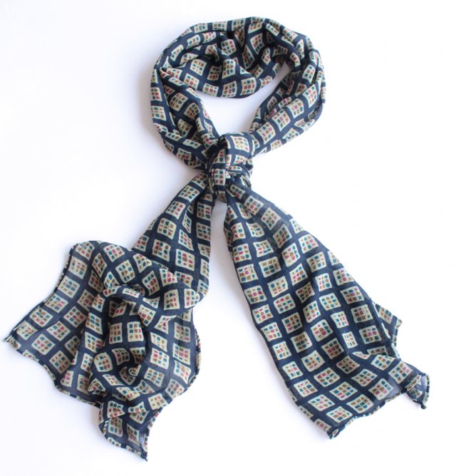 Zwiewny szal wykonany prawdopodobnie z jedwabiu, brzegi rolowane.