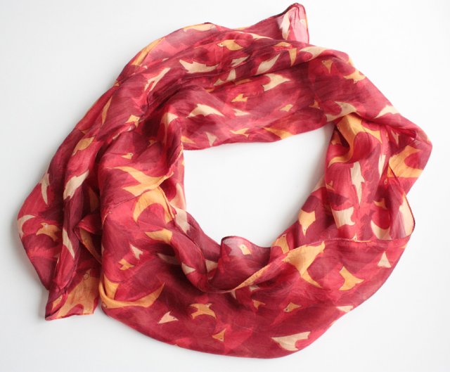 Zwiewny, wzorzysty szal wykonany z delikatnej tkaniny, którą oceniam na jedwab. Materiał ma charakterystyczne dla jedwabiu załamania materiału w jaśniejszym odcieniu.
