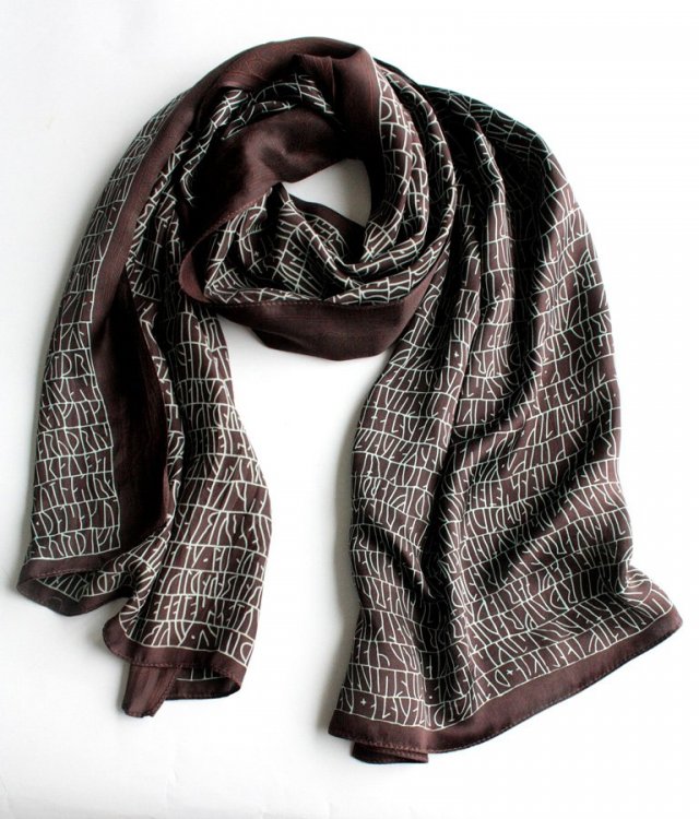 Wzorzysty szal w odcieniu czekoladowego brązu, wykonany prawdopodobnie z jedwabiu.