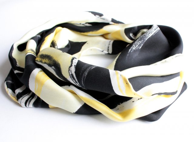 Zwiewny szal w ciekawych kolorach wykonany w mojej ocenie z jedwabiu. Brzegi są ręcznie rolowane.