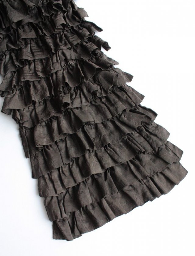 Dodaj swojej stylizacji wyrazu i oryginalności z pomocą tego ciemnobrązowego szala o fasonie kaskady złożonej z wielu nachodzących na siebie falban. Materiał to w mojej ocenie jedwab naturalny.
