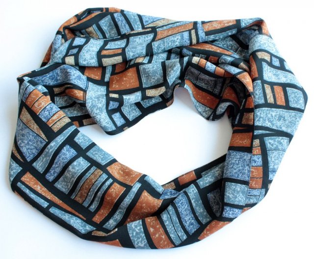 Zwiewny szal w geometryczne wzory. Materiał to prawdopodobnie jedwab naturalny lub syntetyczny.
