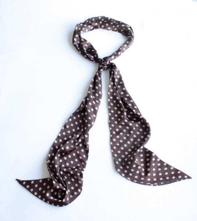 Długi szal w grochy w odcieniu ecru na tle ciepłego brązu. Wykonany prawdopodobnie z jedwabiu naturalnego lub syntetycznego.