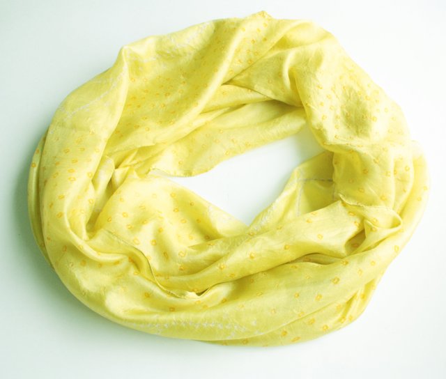 Niezwykle oryginalny jedwabny szal w kolorze żółtym z nutą limonkowej zieleni.