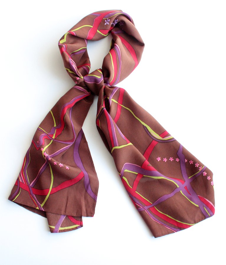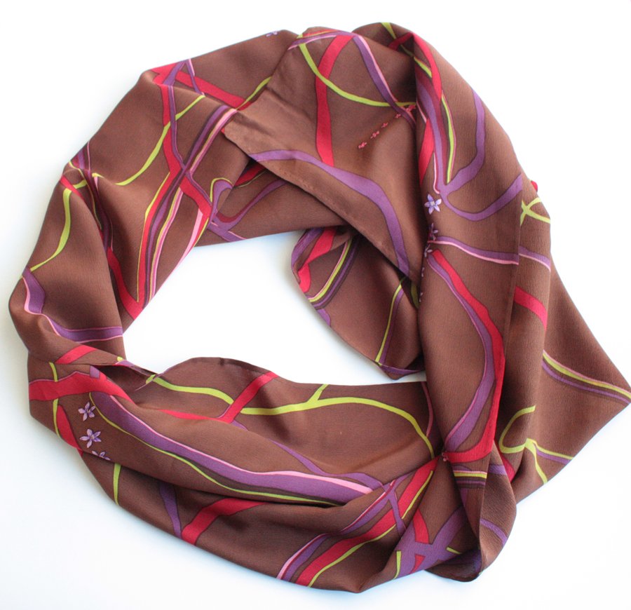 Zwiewny szal we wzory na brązowym tle wykonany prawdopodobnie z jedwabiu.