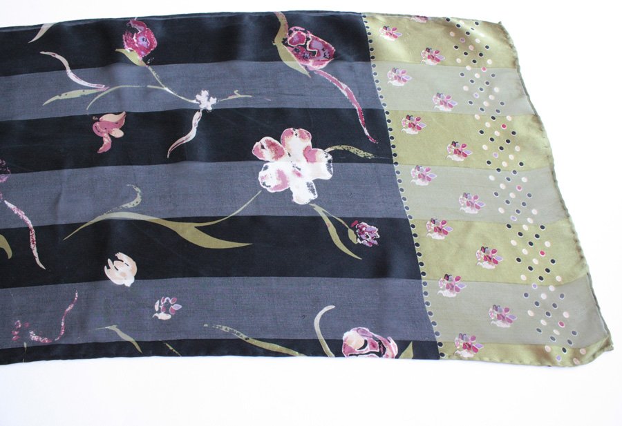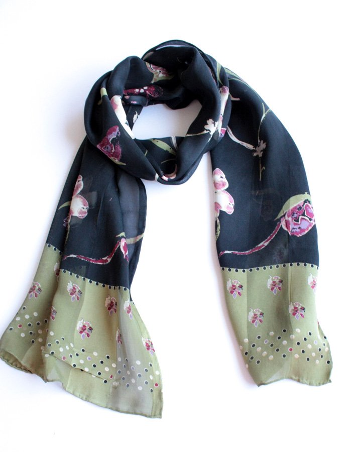 Zwiewny, subtelny szal w kwiatowe wzory. Materiał oceniam na jedwab.