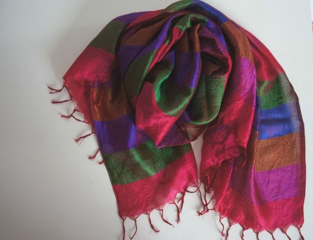 Przepiękny, jedwabny szal z frędzlami. Materiał bardzo zwiewny w żywych, kontrastowych kolorach. Stan bardzo bobry. Idealny na prezent. Gorąco polecam.