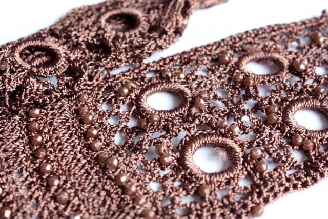 Wyjątkowy szal w kolorze mlecznej czekolady. Szal wykonany jest w mojej ocenie z jedwabnego kordonku na szydełku,miejscami wpleciono subtelne koraliki. Szal będzie pięknym uzupełnieniem eleganckiej stylizacji, świetnie sprawdzi się zamiast biżuterii.