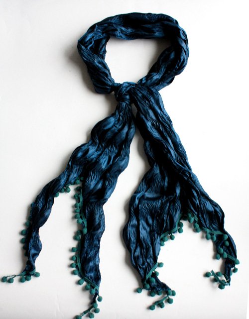 Szal o gniecionej fakturze wykonany ze 100% jedwabiu. Ciekawe wykończenie brzegów.