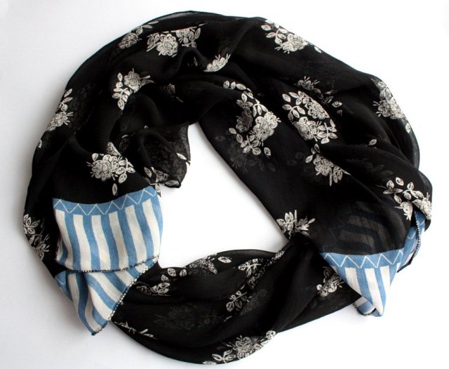 Piękny, zwiewny, półtransparentny szal. Można nosić go na kilka sposobów uzyskując różne efekty (jak na zdjęciu). Materiał oceniam na jedwab naturalny lub syntetyczny.