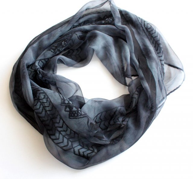 Zwiewny szal w wyjątkowe wzory. Wykonany prawdopodobnie z jedwabiu.