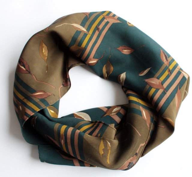 Zwiewny szal w stonowanych kolorach, w ciekawe wzory. Materiał to w mojej ocenie jedwab.