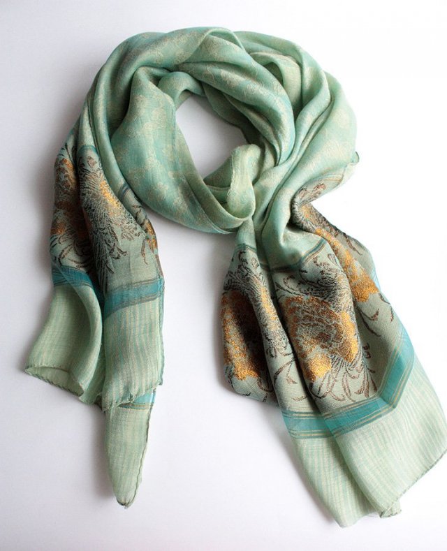 Piękny wytłaczany szal w odcieniach zieleni i turkusu. Kwiatu w odcieniu starego złota. Szal w całości wykonany z jedwabiu o ciekawej strukturze (miejscami półtransparentnej).