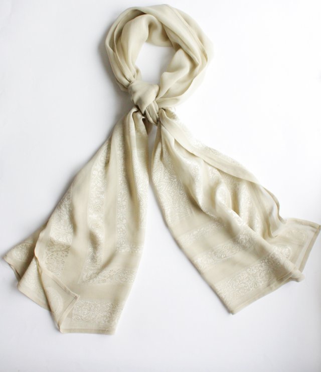 Wspaniały, niezwykle elegancki szal o wytłaczanej fakturze w odcieniu beżu z nutą oliwkową. Materiał to prawdopodobnie jedwab naturalny lub syntetyczny.