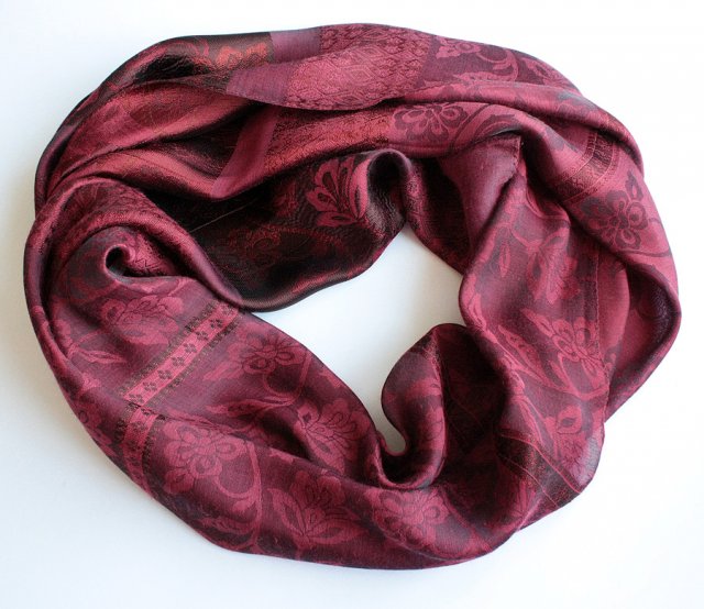 Piękny, wytłaczany szal w kolorze czerwonego wina. Wykonany w 100% z jedwabiu.