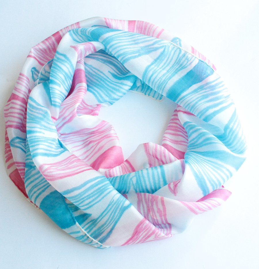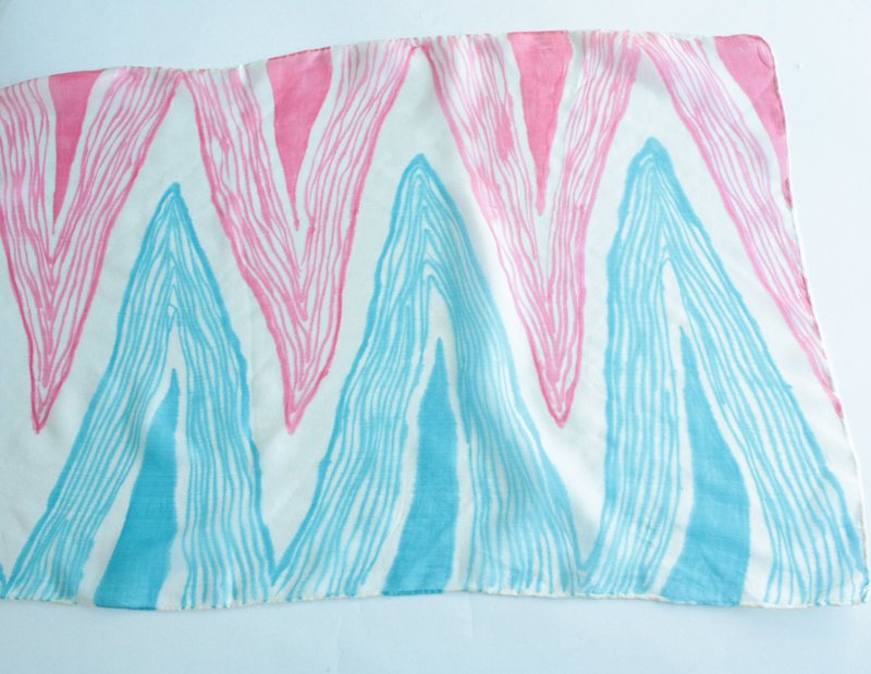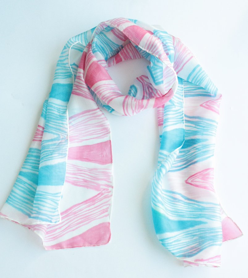 Zwiewny szal w odcieniach błękitu i różu. Materiał to prawdopodobnie jedwab naturalny.