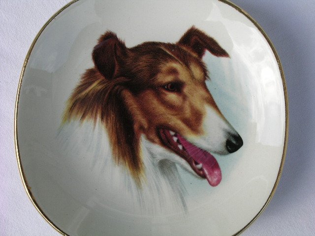 Dawnej daty talerzyk ceramiczny z piękną psią obecnością :) Rant złocony, żywe barwy, ecru tła. Przyjemna obłość kształtu. Sygnowany Weatherby, z dopiskiem o trwałości (Durability). 12,5 x 13 x 2 cm. Stan zachowania bardzo dobry.