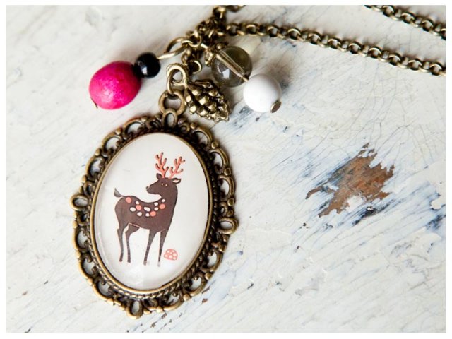 Naszyjnik JELONEK to bardzo romantyczne, nostalgiczne i kobiece malutkie dzieło sztuki. Obrazek pod szkiełkiem to wesoła miniaturka graficzki opracowanej w moim studio. Grafika i naszyjnik to połączenie nowoczesności z romantycznym antycznym nastrojem.