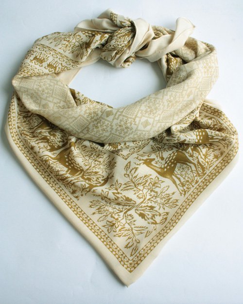 Miękka chusta w beżowo-zielone wzory. Materiał to prawdopodobnie bawełna.