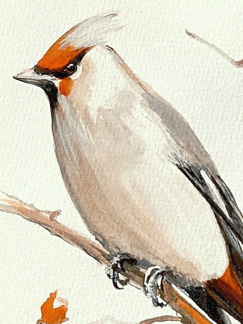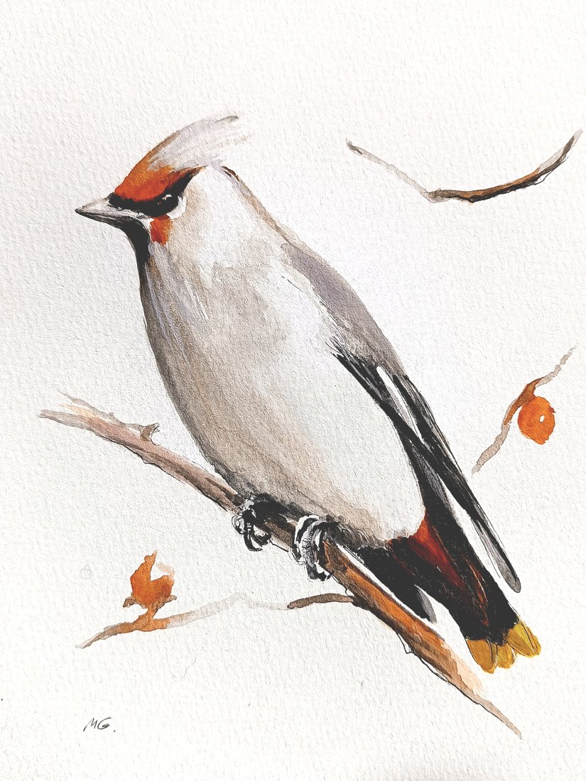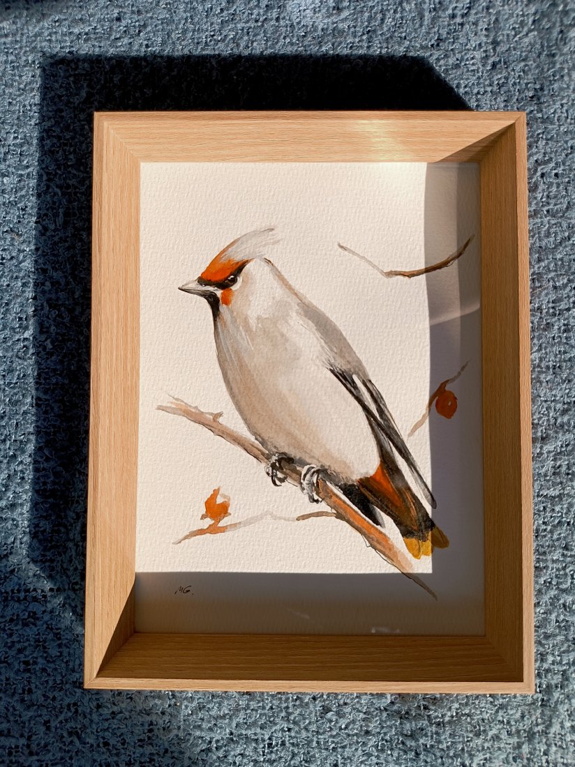 Ręcznie malowana akwarelka na papierze 300g, farbami i tuszami Derwent, z użyciem cienkopisów Winsor & Newton i Sakura.Jest to oryginał, oprawiony w kasetonową ramkę MDF w kolorze jasnego drewna, za szkłem. Wymiary obrazka 21,6x16,6x3cm. Idealny prezent dla miłośnika ptaków! :-)