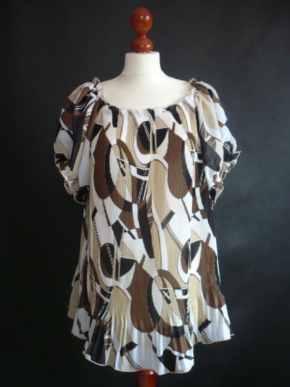 Bluzka w dużym rozmiarze JENNIFER LLOYD. Przód i tył plisowany. Na dole falbanka.Rękawy zebrane gumką.Gumka przy dekolcie.
