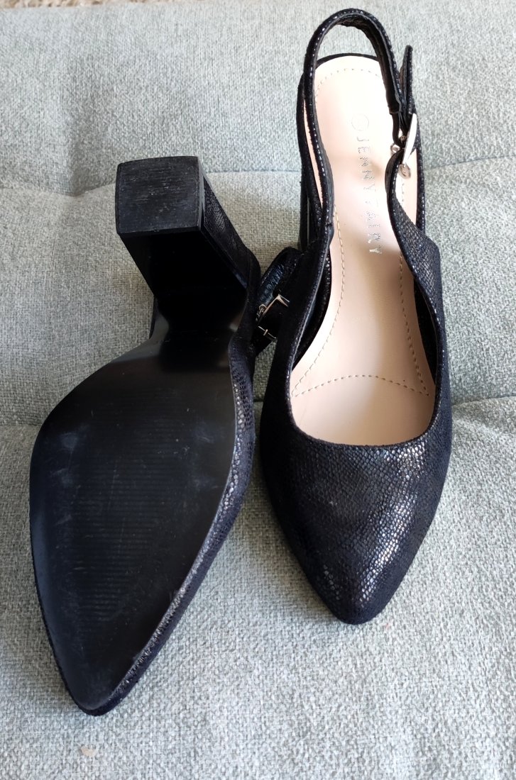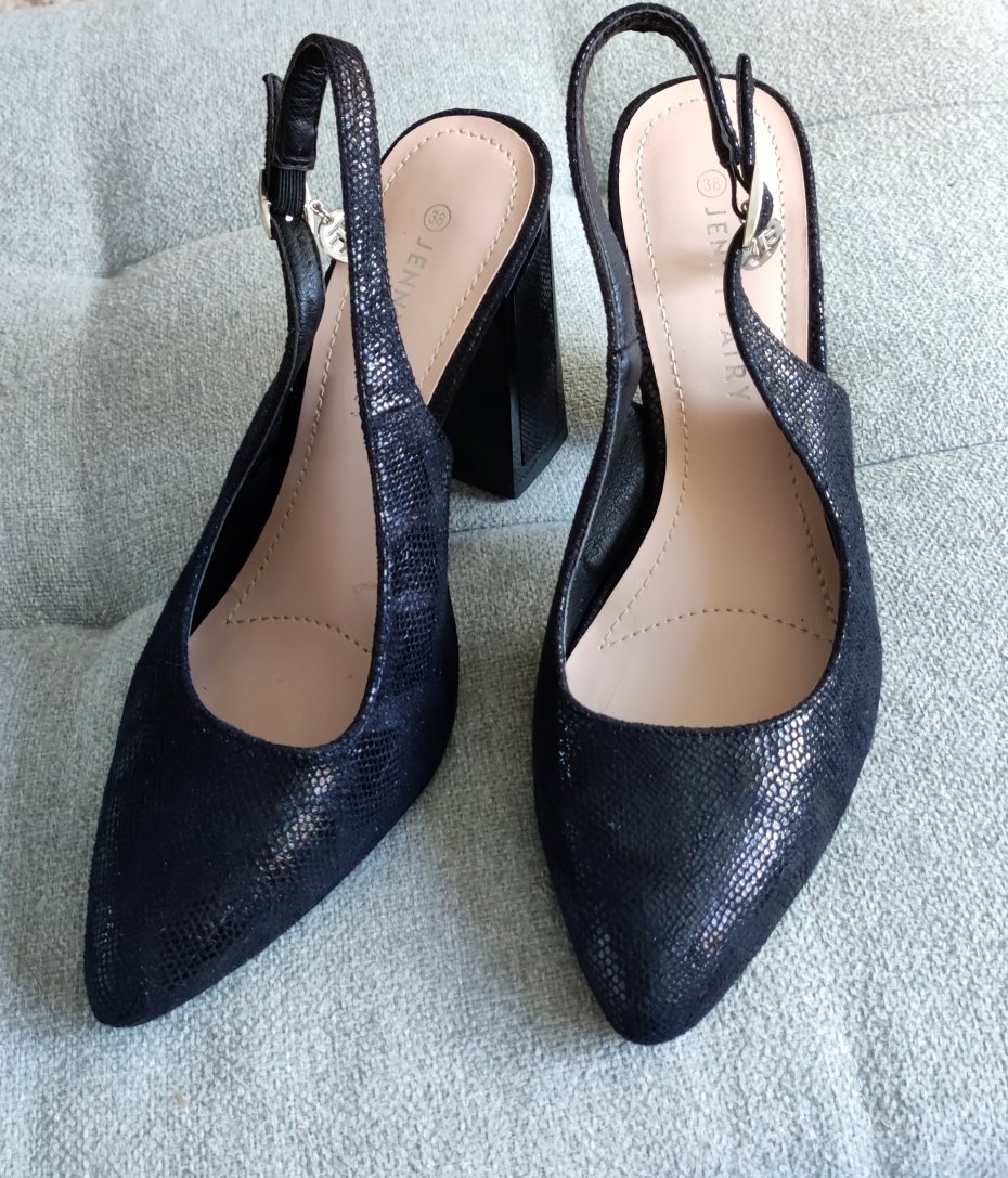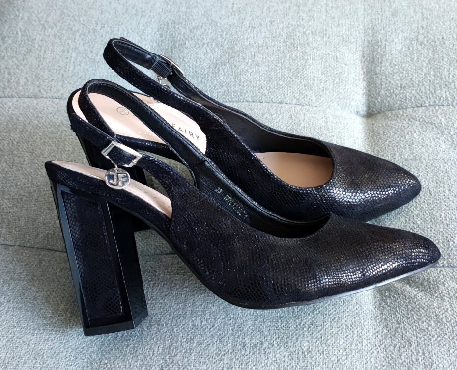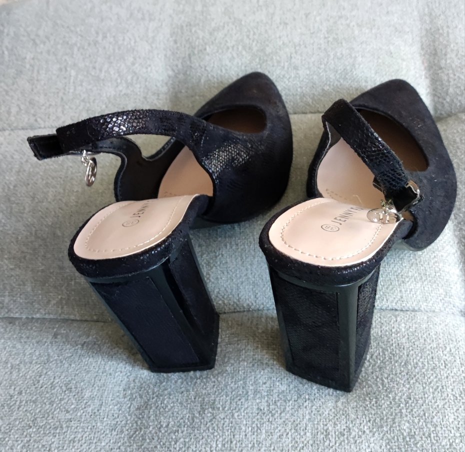 Buty wyjściowe na wysokim ale stabilnym obcasie. Ostatnie zdjęcie przedstawia materiał wierzchni buta, coś jak nubuk z lakierowanymi centkami.
