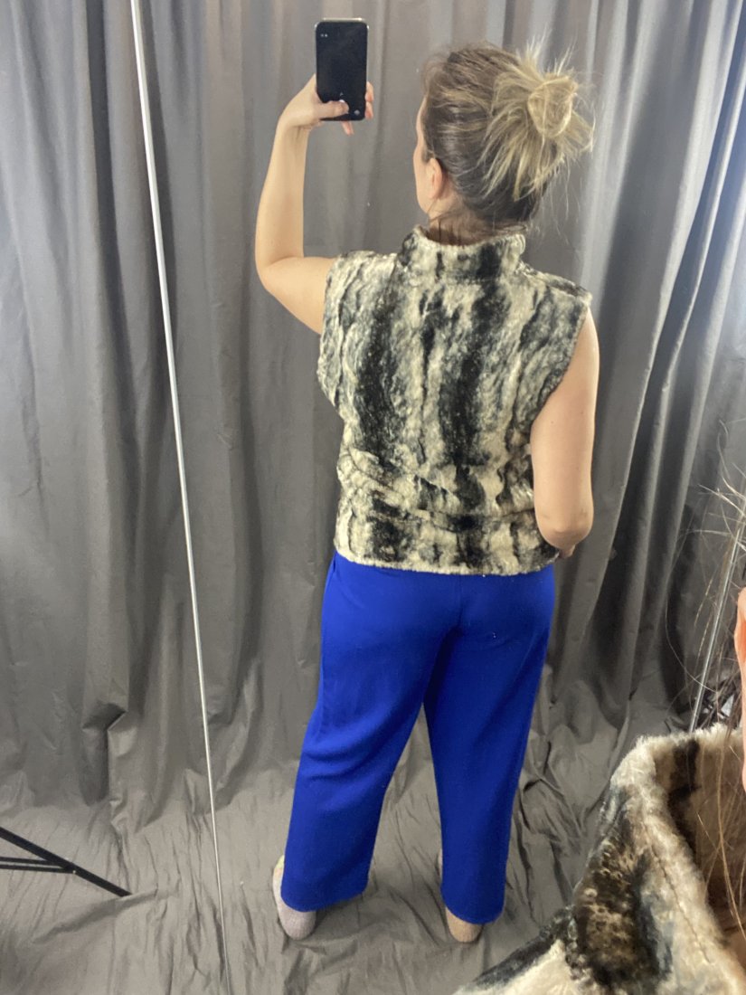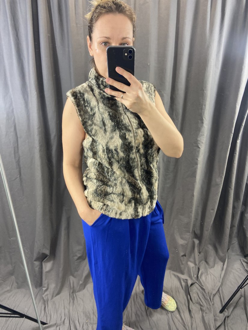 Świetna, futerkowa kamizelka marki Jensen. Zapinana na zamek. Posiada podszewkę. 64% wiskoza, 28% bawełna, 8% modal. Podszewka z acetatu.