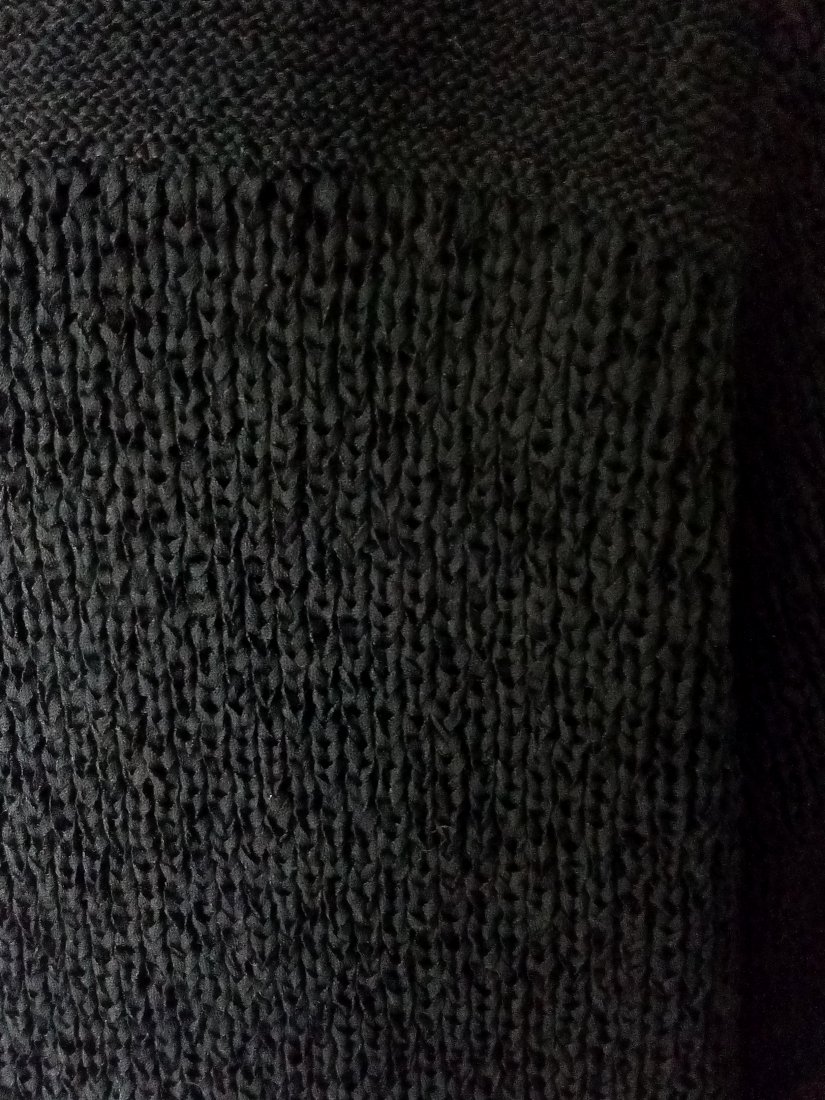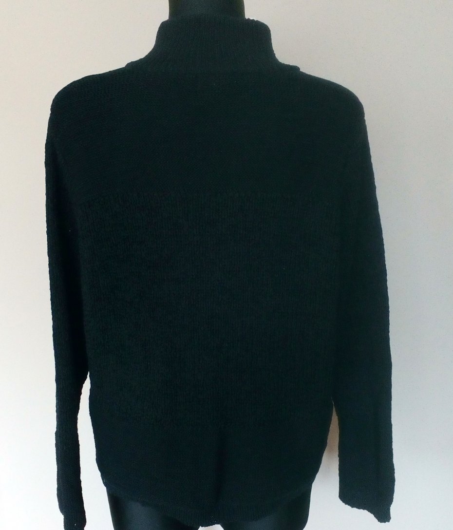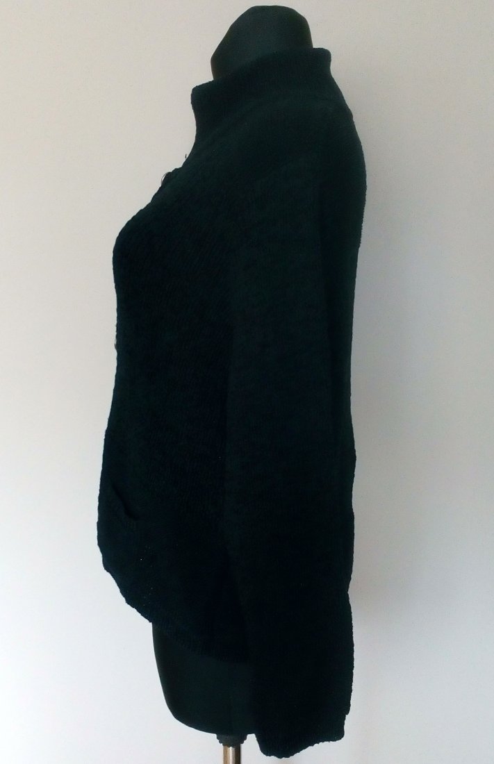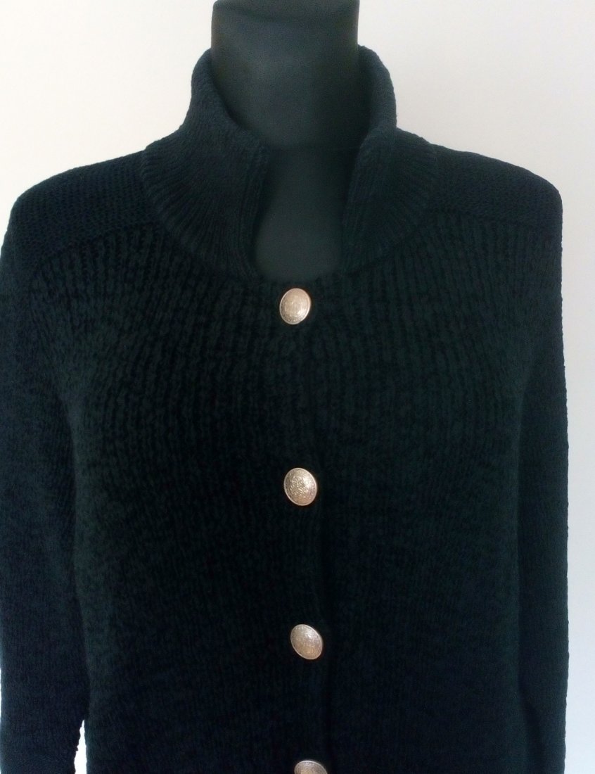 Czarny sweter z tasiemkowej włóczki, zapinany na lekkie, metalowe guziki z grawerem w srebrnym kolorze, u dołu przodu naszywane małe kieszonki