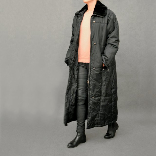 Czarny, długi płaszczyk, lekko pikowany. Jesienny. Z futerkowym kołnierzem. Zapinany na zamek i guziki, po bokach kieszonki.