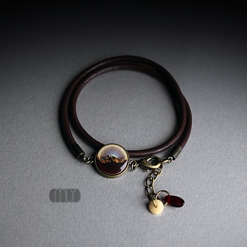 Efektowna bransoletka wykonana z rzemienia jubilerskiego w kolorze brązowym, elementów w kolorze starego złota i ręcznie wykonanej ceramicznej zawieszki, szkliwionej mieszanką kremowych i bordowych szkliw z efektem plamek o subtelnym połysku, Obwód regulowany. Polecam