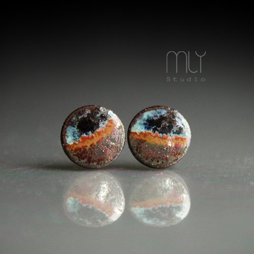 Okrągłe, lekko nieregularne ceramiczne kolczyki w formie sztyftów, ręcznie wykonane z delikatnej czekoladowobrązowej gliny kamionkowej, jednostronnie szkliwione mieszanką zielonkawo brązowych szkliw z efektem plamek i subtelnym połyskiem, na antyalergicznych sztyftach w kolorze srebrnym. Średnica ok. 11mm.Polecam
