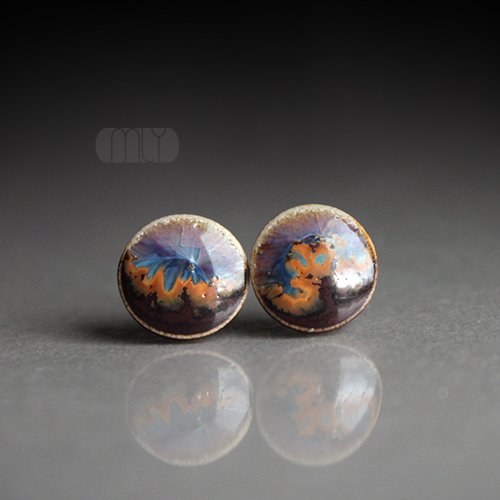 Ceramiczne, lekko nieregularne kolczyki w formie sztyftów, ręcznie wykonane z delikatnej czekoladowobrązowej gliny kamionkowej, jednostronnie szkliwione efektowną mieszanką błyszczących beżowo kremowych i bordowych szkliw z efektem plamek, na antyalergicznych sztyftach w kolorze srebrnym.Średnica ok. 11mm. Polecam