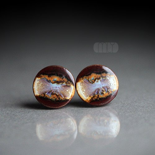 Ceramiczne, lekko nieregularne kolczyki w formie sztyftów, ręcznie wykonane z delikatnej czekoladowobrązowej gliny kamionkowej, jednostronnie szkliwione efektowną mieszanką błyszczących beżowo kremowych i bordowych szkliw z efektem plamek, na antyalergicznych sztyftach w kolorze srebrnym.Średnica ok. 11mm. Polecam