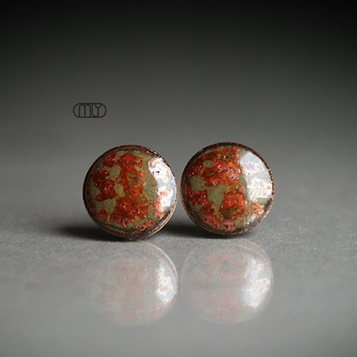 Okrągłe, lekko nieregularne ceramiczne kolczyki w formie sztyftów, ręcznie wykonane z delikatnej czekoladowobrązowej gliny kamionkowej, jednostronnie szkliwione mieszanką zielonkawo brązowych szkliw z efektem plamek i subtelnym połyskiem, na antyalergicznych sztyftach w kolorze srebrnym. Średnica ok. 11mm.Polecam