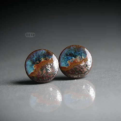 Okrągłe, lekko nieregularne ceramiczne kolczyki w formie sztyftów, ręcznie wykonane z delikatnej czekoladowobrązowej gliny kamionkowej, jednostronnie szkliwione mieszanką zielonkawo brązowych szkliw z efektem plamek i subtelnym połyskiem, na antyalergicznych sztyftach w kolorze srebrnym. Średnica ok. 11mm.Polecam