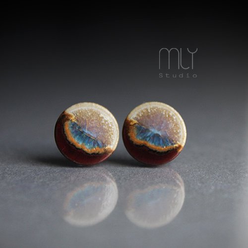 Ceramiczne, lekko nieregularne kolczyki w formie sztyftów, ręcznie wykonane z delikatnej czekoladowobrązowej gliny kamionkowej, jednostronnie szkliwione efektowną mieszanką błyszczących beżowo kremowych i bordowych szkliw z efektem plamek, na antyalergicznych sztyftach w kolorze srebrnym.Średnica ok. 9mm. Polecam