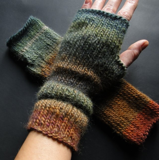 Ciepłe, mięsiste mitenki wykonane na drutach z miłej w dotyku włóczki ( 30% wełna, 70% akryl ) - bezszwowe, długość ok. 27 cm. Przepiękna jesienna paleta!. Polecam. Ze względu na układ barw - pojedynczy egzemplarz.