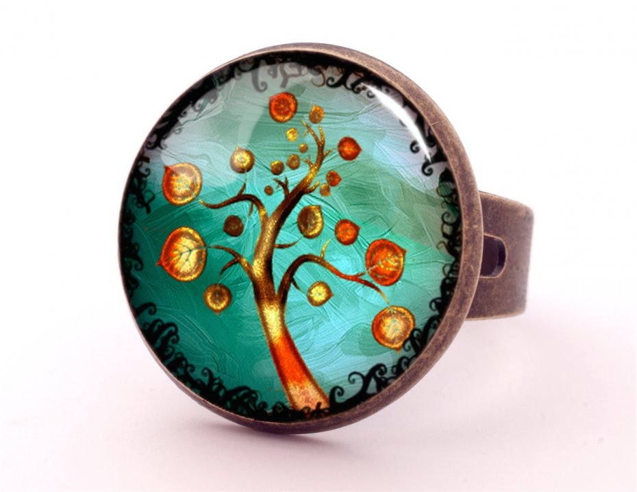 Ręcznie robiony regulowany pierścionek z wysokiej jakości grafiką pokrytą wypukłym, powiększającym szkiełkiem.
