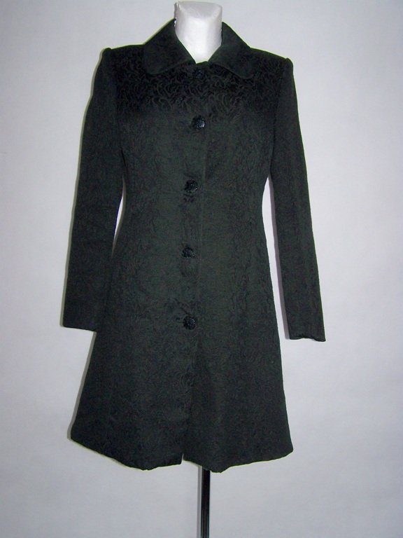 Czarny dłuższy płaszcz na jesień w tłoczony wzór ,w kształcie litery A,Płaszcz na podszewce, zapinany na tłoczone czarne guziki.w Ramionach poduszki. Z tyłu płaszcza na dole rozcięcie.